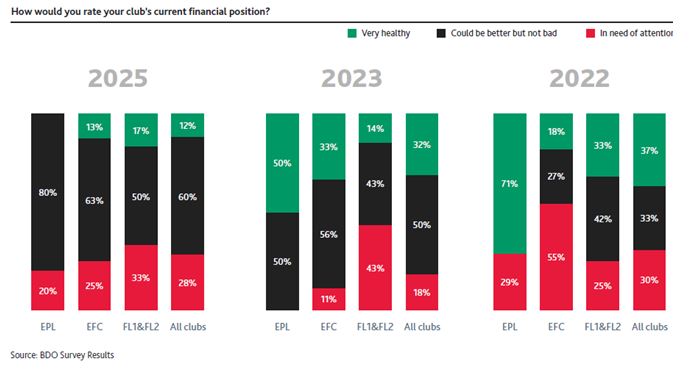 La percepción de los CFO acerca de las finanzas de los clubes de la Premier (EPL) y la segunda (EFC) es mayoritariamente negativa y, lo que resulta más llamativo, ha empeorado en el último lustro: