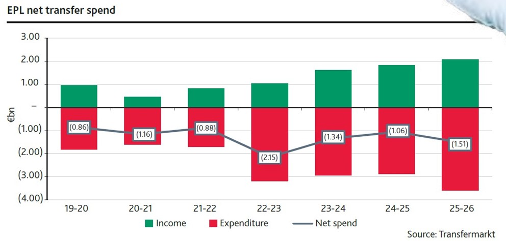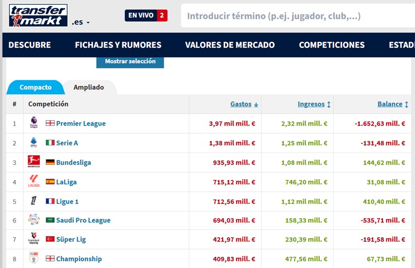 El saldo neto, la diferencia entre lo invertido en fichajes y las ventas, se distancia cada año más del resto de ligas. Ni siquiera se le acerca la saudí: