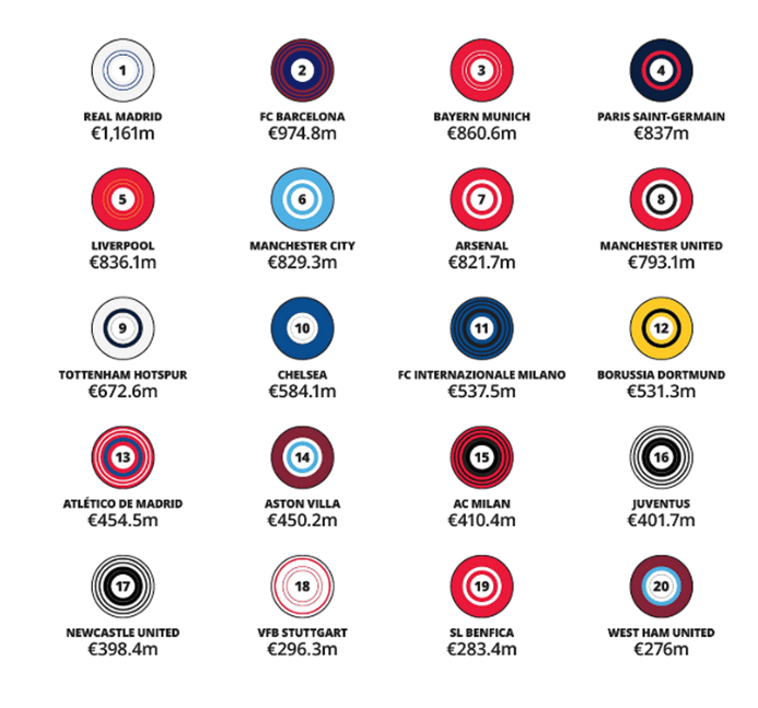Los seis siguientes puestos están ocupados por el Big Six de la Premier y en la lista de los veinte primeros aparecen otros tres clubes ingleses: Aston Villa, Newcastle y West Ham. Luego de primeras sí podríamos decir que la “clase media” es mucho más potente que la del resto de ligas europeas que, en el mejor de los casos, cuentan con dos o tres equipos potentes con una gran distancia sobre el resto. Si entramos al detalle de las cifras del informe de Deloitte, se pueden extraer otras conclusiones interesantes: