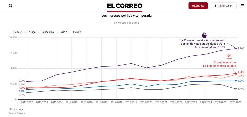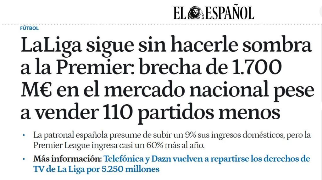 El contrato firmado por la Premier posibilita que todos los clubes tengan unos ingresos muy elevados, incluso los de la Segunda división (EFC), y pueden acceder a fichajes que, aunque no sean del primerísimo nivel, sí les permita ser competitivos. La brecha entre LaLiga y la Premier crece tras los recientes acuerdos firmados: