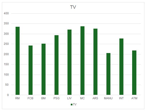 En el apartado de Matchday, ingresos por estadio y días de partido, si descontamos el efecto de la venta anticipada de palcos de los clubes españoles, las cifras quedan bastante equilibradas, con la excepción del Manchester City, que obtiene unos ingresos muy inferiores a las de los equipos de su misma Liga. La mitad que su gran rival de Manchester, pese a que la trayectoria deportiva de uno y otro sea muy diferente en los años recientes