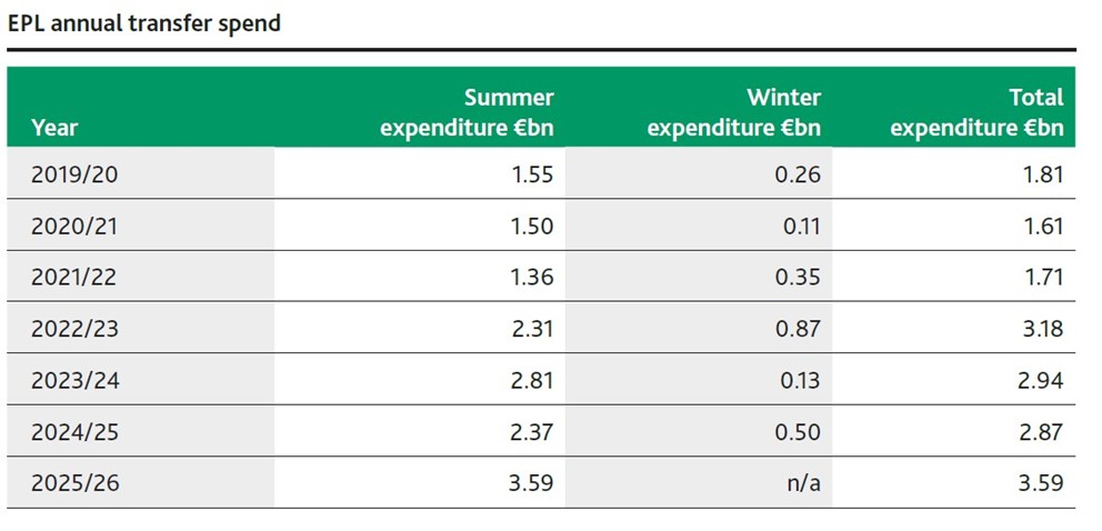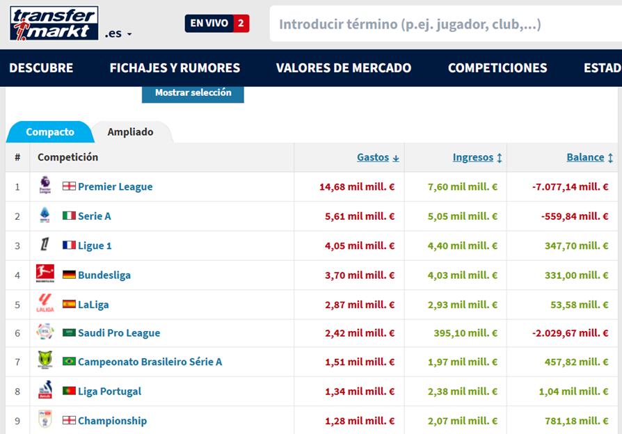 El saldo neto, la diferencia entre lo invertido en fichajes y las ventas, se distancia cada año más del resto de ligas. Ni siquiera se le acerca la saudí: