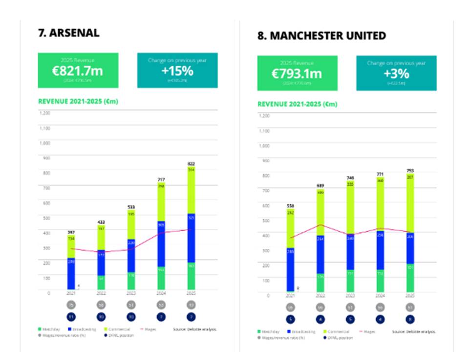 Los seis siguientes puestos están ocupados por el Big Six de la Premier y en la lista de los veinte primeros aparecen otros tres clubes ingleses: Aston Villa, Newcastle y West Ham. Luego de primeras sí podríamos decir que la “clase media” es mucho más potente que la del resto de ligas europeas que, en el mejor de los casos, cuentan con dos o tres equipos potentes con una gran distancia sobre el resto. Si entramos al detalle de las cifras del informe de Deloitte, se pueden extraer otras conclusiones interesantes: