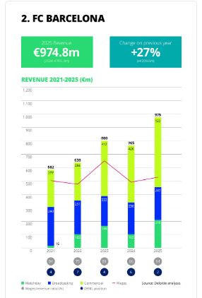 El Real Madrid ha tenido un descenso del 6% en los ingresos por los días de partido, pero el propio informe indica que se debe a una venta de los asientos VIP realizada en 2024, lo que, ajustando los ingresos de ese año, los reducirían hasta 807 millones en total (lo que a Laporta le gusta denominar “palanca”). La masa salarial se mantiene controlada respecto a los ingresos totales, por debajo del 50%, como desde hace años. En el año analizado, los derechos de televisión son muy elevados porque a los nacionales se unen los ingresos por la Champions en un año en el que no solo se logró el título, sino que, además, la baja prestación del resto de equipos españoles hizo que los ingresos por market pool de LaLiga cayeran casi exclusivamente en las arcas del club. La potencia de otros ingresos adicionales, como la venta de camisetas, los ingresos del estadio o los patrocinios se mantienen en cifras muy elevadas, top mundial.