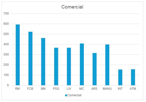 En el apartado de Matchday, ingresos por estadio y días de partido, si descontamos el efecto de la venta anticipada de palcos de los clubes españoles, las cifras quedan bastante equilibradas, con la excepción del Manchester City, que obtiene unos ingresos muy inferiores a las de los equipos de su misma Liga. La mitad que su gran rival de Manchester, pese a que la trayectoria deportiva de uno y otro sea muy diferente en los años recientes
