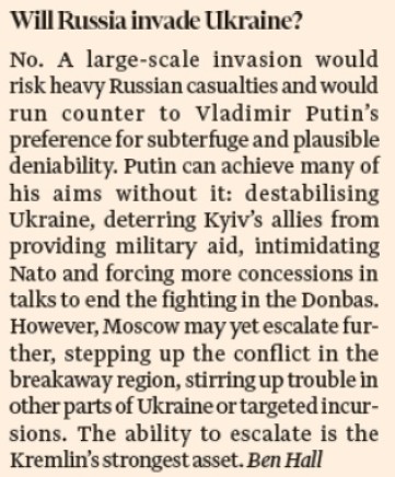 - ¿Tendrá Zelenski que renunciar al Donbás para alcanzar un acuerdo de paz en Ucrania? Según Ben Hall, no, si bien las informaciones de esta semana, en el cuarto aniversario del inicio de la invasión, parecen indicar que esta cesión será el punto crítico de la negociación. Lo más terrible de la resolución de este conflicto es que todo hace indicar que Putin se saldrá en buena parte con la suya, con la nueva frontera delimitada gracias a la fuerza de la ocupación. Nada que deba extrañar a nadie tras la ocupación de Crimea en 2014 y la aparente aceptación del resto del mundo. Ahora se incorporan 133.000 kilómetros cuadrados más. De momento. ¿Dónde acaban estos impulsos expansionistas?