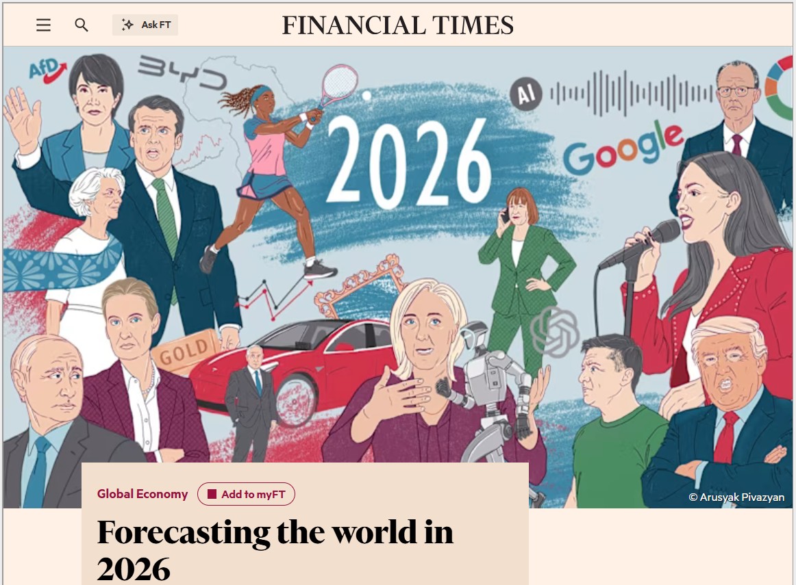 El artículo de Financial Times es interesante porque trata cuestiones muy diversas sobre las elecciones en Francia (no de momento), el cuarto mandato de Lula en Brasil (un sí en las apuestas), la apreciación del renminbi chino (no con reservas), la continuidad de Takaichi en Japón (sí, para los curiosos), acerca de si tendremos robots caseros (¿acaso no los tenemos ya, aunque no tengan patas?) o el crecimiento demográfico y económico de África, pero es una pena que no se meta más en las procelosas cuestiones de Oriente Medio, no mucho más allá de una pregunta poco relevante acerca de la relación entre Arabia Saudí e Israel. Si viramos algo más de la geopolítica a la economía, podemos enlazar con algunas predicciones para este año del que ya han volado dos meses. Resulta todo tan cambiante en el ámbito de la economía que acertar puede deberse tanto a la casualidad como a la causalidad. A modo de ejemplo, en este artículo de El País del 2 de enero se podían encontrar hasta cuatro análisis totalmente distintos de lo que puede esperarse del año: