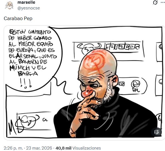 - Minusvalorar al Real Madrid, algo que lleva haciendo desde que ejerce como entrenador y que ha elevado al paroxismo tras la cuarta eliminación en cinco años a manos de los blancos. Del “son atletas” tras el 0-4 de Múnich a la escocida frase “el Madrid no ha sido mi mayor desafío estos años, ha sido Klopp”. Como bien dijo alguien en redes sociales, Klopp será su mayor desafío superado, como acreditan los 6 títulos de Premier del City en los últimos 8 años. Su mayor desafío atragantado y no superado es el Madrid por mucho que le duela, pues solo ha conseguido la Champions en este último lustro en la única ocasión en que logró derrotar a los de Ancelotti y Arbeloa. Pep es un gran entrenador, no cabe duda, pero no resulta nada objetivo cuando habla del equipo por el que se marchó de Barcelona (la Liga de los récords de Mou lo dejó exhausto mentalmente). Nada más ganar la Carabao Cup el pasado fin de semana, volvió a la carga: “El Arsenal es, junto al Bayern de Múnich, y quizás el Barça, el mejor equipo de Europa”. Ni el PSG campeón de Europa que se los ventiló con solvencia en octubre, ni el Real Madrid “mediocre” de Arbeloa que le endosó un 5-1 en la eliminatoria. Como bien explicó el genial Marselle: