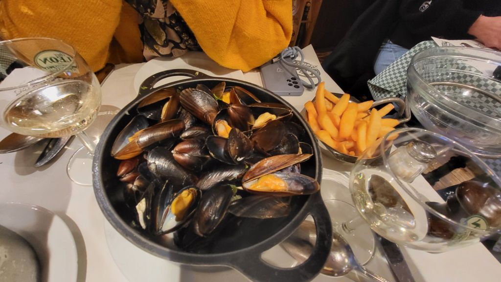 cerveza con patatas fritas, mejillones al vino blanco con muchas patatas fritas y