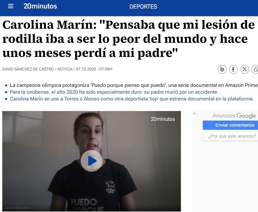SR. RODRÍGUEZ.- Puede que a priori le parezca que no tiene gancho, pero es un argumento que no tiene nada que envidiar a Rocky Balboa y sus entrenamientos por Filadelfia. La trama se desarrollaría en Huelva, una ciudad al sur de España en un país sin ninguna tradición en bádminton. La suya es una historia de determinación, de lucha, de garra, le puedo pasar la serie que ya existe en Amazon Prime, «Puedo porque pienso que puedo». Carolina solo conoce el triunfo, la victoria, fue campeona olímpica en Río 2016 y tres veces campeona del mundo. Se sobrepuso a una rotura del cruzado de la rodilla derecha en 2019 y, cuando se preparaba para defender el título en Tokio, se rompió el ligamento cruzado anterior y los dos meniscos de la rodilla izquierda. Pero se repone a todos los palos que le da la vida, aunque el más doloroso fue la muerte de su padre.