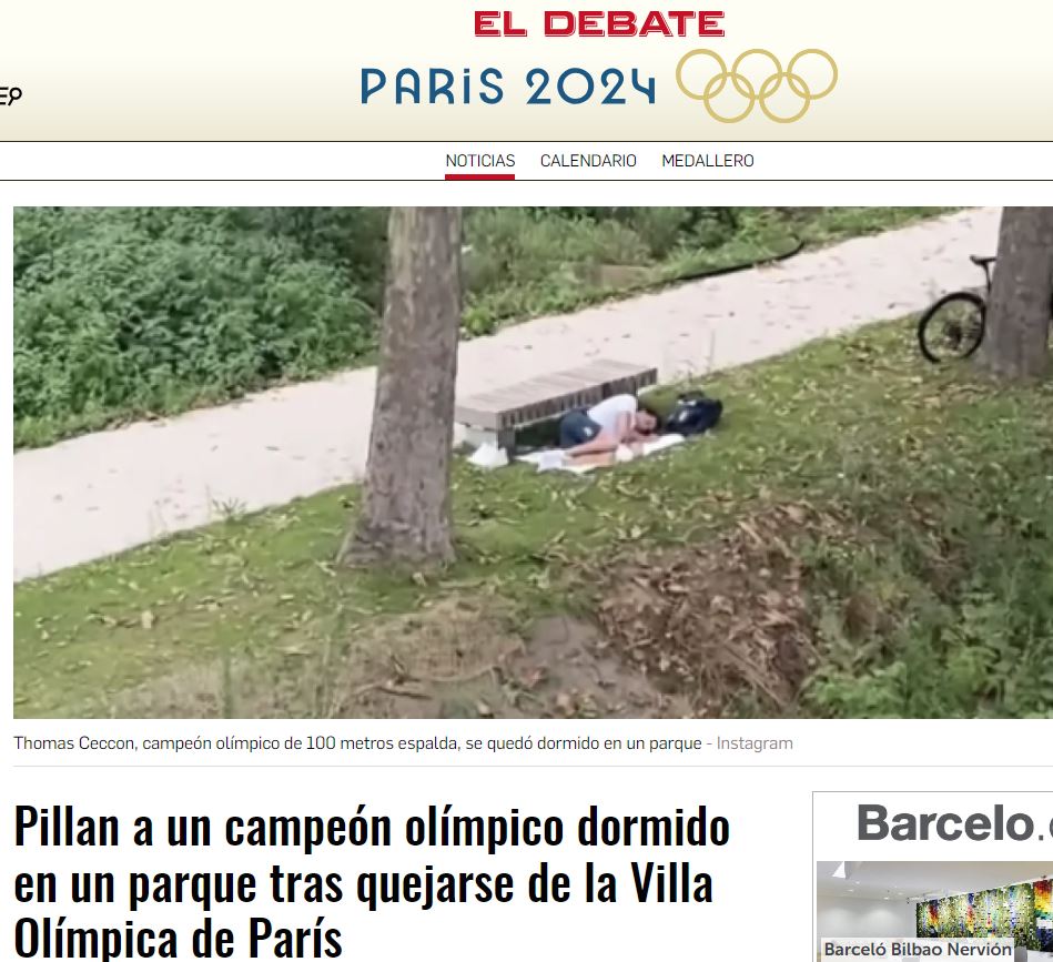La villa olímpica y la comida de los atletas. En esa línea de postureo, se construyó la villa olímpica con criterios ecológicos y de sostenibilidad. Mucha madera, material reciclable y un fuerte compromiso para reducir las emisiones de CO2 a la mitad en comparación con las de Río 2016. Desconozco cómo se realizan dichas mediciones, si incluyen todos los traslados en avión de los deportistas, el desplazamiento de seguidores y equipos técnicos, el desgaste de energía que ha habido para limpiar el Sena, etc. Todo lo que se haga en este sentido y no sea postureo, bienvenido sea. El problema ha surgido cuando llegaron las quejas de los atletas por la mala calidad del alojamiento, la incomodidad de las camas, el poco espacio en las habitaciones y el mal funcionamiento del aire acondicionado. La polémica se acrecentó cuando aparecieron las imágenes del campeón olímpico de los 100 metros espalda (el italiano Thomas Ceccon) durmiendo en un parque por la incomodidad del recinto.
