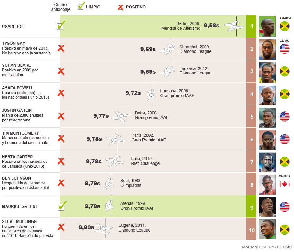 Menos mal que tenemos a Usain Bolt, el jamaicano que nos devuelve la ilusión por esta prueba después de los años de los sospechosamente musculados atletas estadounidenses. Y jamaicanos, que también los ha habido. Me parece una vergüenza que se permita correr a Justin Gatlin después de sus dos positivos en 2001 y 2006, pero el hecho de verle y de verle perder con Bolt aumenta la emoción y el espectáculo. También han dado positivo Tyson Gay, Asafa Powell, Yohan Blake,… Aunque ninguno tan sonado como Ben Johnson en Seúl 88. Disfruté enormemente con las victorias del canadiense en Roma 87 y en Seúl, aunque lo cierto es que sus ojos amarillos y su enorme musculatura ya parecían sospechosos.