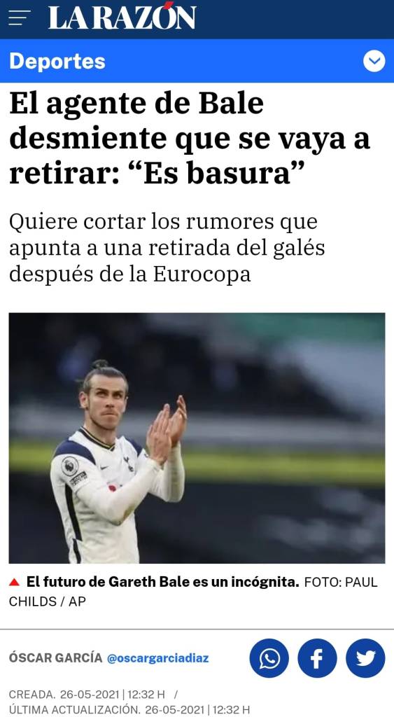 Otra vez hablando del «golfista», y buscando una foto de un futbolista en su tiempo libre, qué asco dan. Bale sodomiza periodistas, como dije en su día, y come carne picada de hijos de periodistas, solo así se entiende el odio que le tienen. La noticia es del 4 de junio, y parece que no les importa que hace ya más de una semana el agente del jugador hubiera dicho lo contrario: