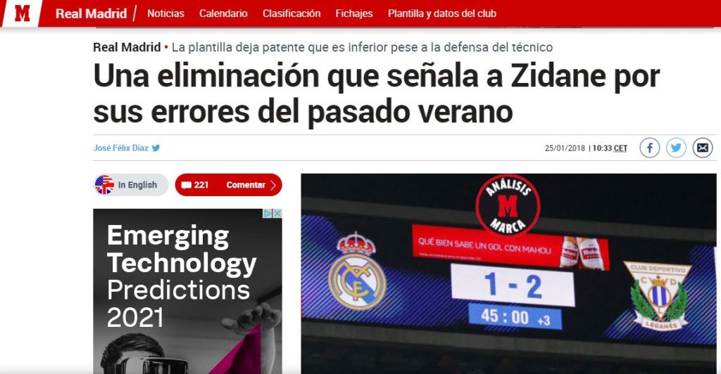 Recuerdo las desagradables portadas y anuncios del Marca con los nombres de los supuestos entrenadores para cuando se echara a Zidane. Solo pensar que algunos directivos podían tener interés en que se filtraran estas noticias me revuelve el estómago: